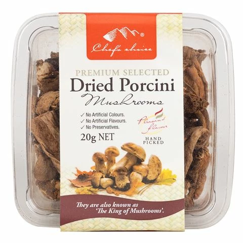 Dried Porcini is famous all over the world for its concentrated flavour and mouth-watering aroma that is a perfect addition to any risotto, soup or sauces. Chef’s Choice have selected only the finest porcini mushrooms so that you can enjoy the ‘King of Mushrooms’ anytime and anywhere you desire.
