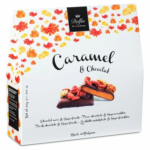 Serve the refined and delicious taste of Belgium this festive season with Dolfin Caramel & Chocolate with Dark Chocolate & Superfruits . These exotic squares are delicate enough to pair with any beverages from desert wine to coffee.