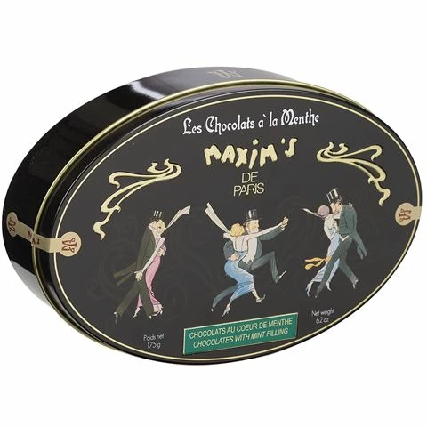 Maxim’s Chocolates With Mint Filling are arrayed in a black tin decorated with 30s style men and women dancing, just as they once did at the famous restaurant, which peaked at the time when Coco Chanel and Christian Dior were visible presences in the French Capital.