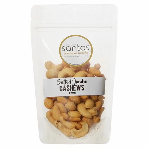 Santos Premium Quality Salted Cashes are just right for serving with drinks or for enjoying any time you want a healthy snack.