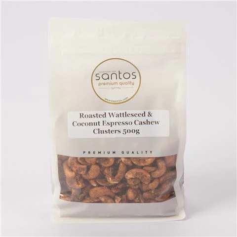 Santos Premium Quality Roasted Wattleseed & Coconut Espresso Cashew Clusters are just right for serving with drinks or for enjoying any time you want a healthy snack.